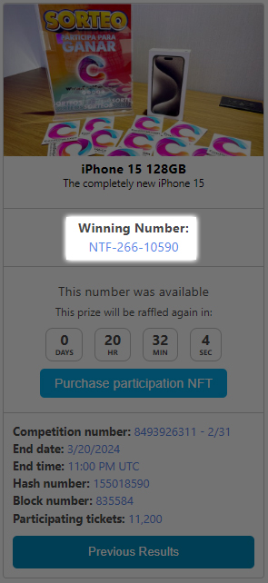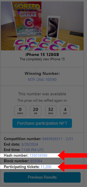 In the previous example, the number obtained from the Hash was: 155018590, so the resulting winning ticket was the number 10,590. If the hash number had been greater by 1 digit, (that is, 155018591), then, The winning ticket would be the number 10,591. For each extra digit added to the hash, the number of the winning ticket increases by 1 until reaching the maximum ticket, which in our example is the number 11,200 (when the result of the operation is zero). Then the result would be 1 again, and then 2, and then 3, etc… allowing the winning tickets to be chosen cyclically infinite times.
